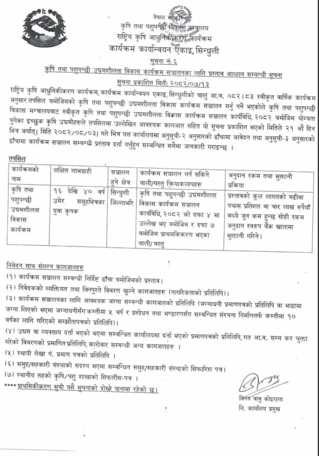 कृषि तथा पशुपन्छी उद्यमशीलता विकास कार्यक्रम सञ्चालनका लागि प्रस्ताव आव्हान सम्बन्धी सूचना ।