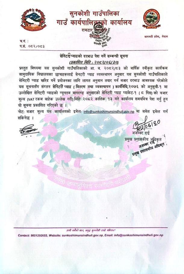 सेनिटरी प्याडकाे दरभाउ पेश गर्ने सम्बन्धी सूचना