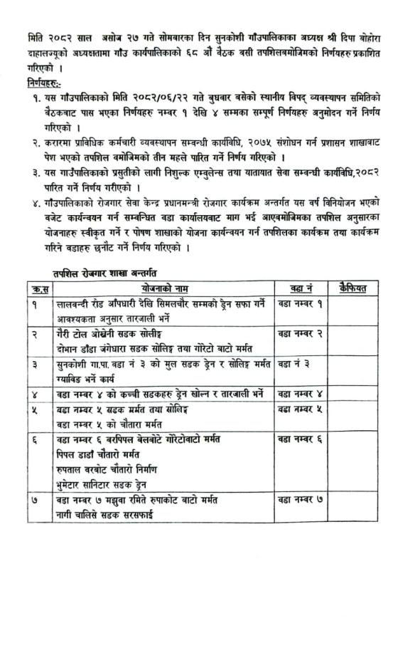 मिति २०८२।०६।२७ गतेको ६८ औ गाउँ कार्यपालिका बैठकबाट हरेक पटकको कार्यपालिकाको निर्णयहरु प्रकाशन गरिने सम्बन्धी जानकारी गराउछौं ।