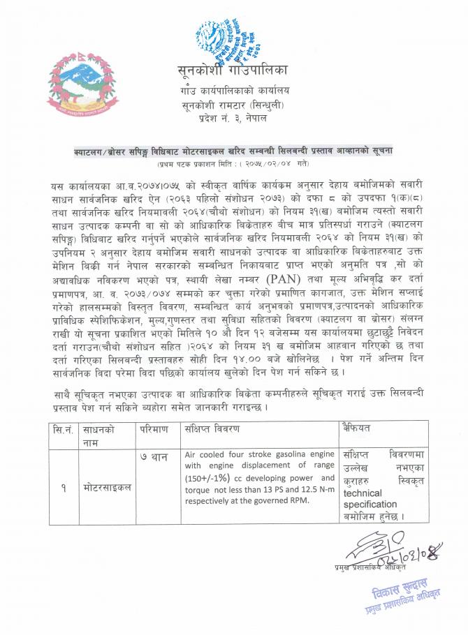 क्याटलग ब्राेसर सपिङ्ग विधिबाट माेटरसाइकल खरिद सम्बन्धी सिलबन्दी प्रस्ताव अाव्हानको सूचना