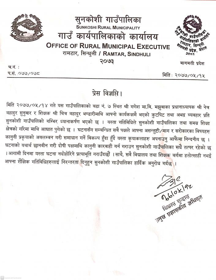 । आगामी दिनमा यस्ता घटना नदोहोरिने प्रत्याभूति गराउँदछौं । साथै, सवै विद्यालय तथा शिक्षक बर्गमा हतोत्साही नभई