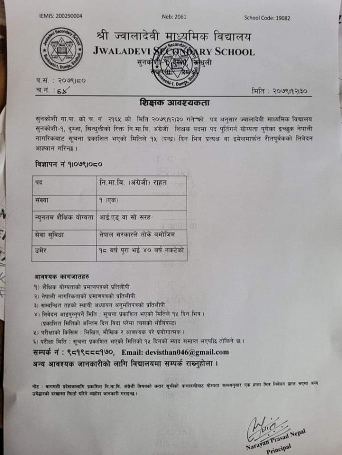 शिक्षक आवश्यकता सम्बन्धि सुचना !!