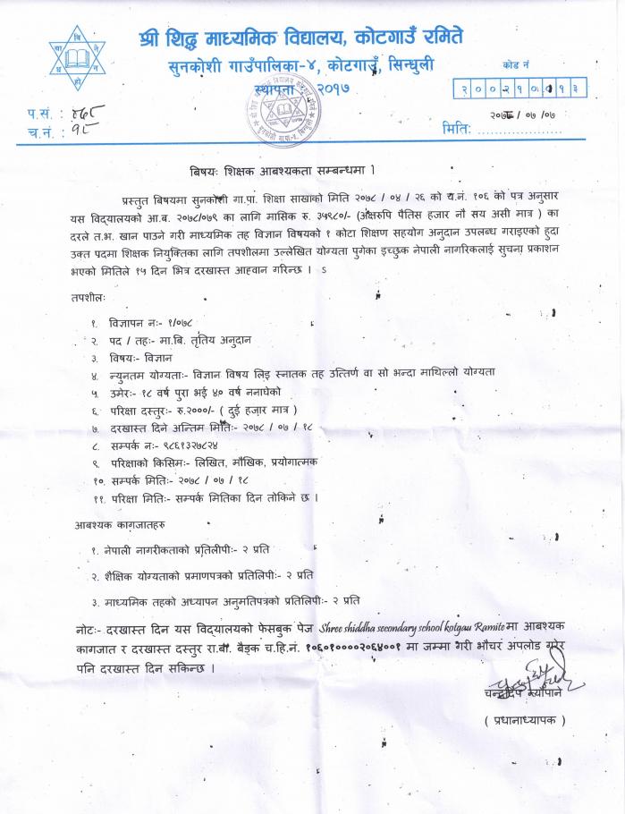 शिक्षक आवश्यकता सम्बन्धि सूचना!!