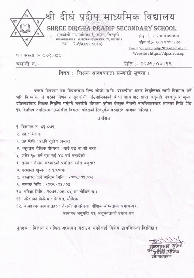 श्री दीर्घ प्रदीप माध्यमिक विद्यालयमा शिक्षक आवश्यक सम्बन्धी सूचना ।