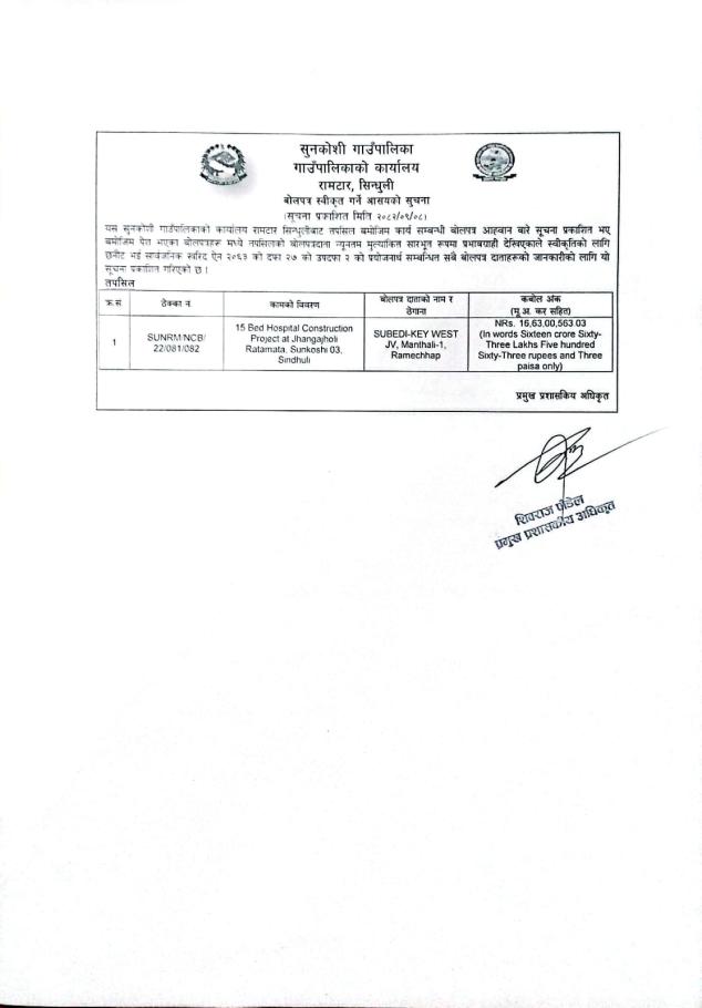 बोलपत्र स्वीकृत गर्ने आसयको सूचना